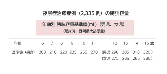 膀胱容量の目安 = 夜尿のない朝の排尿量