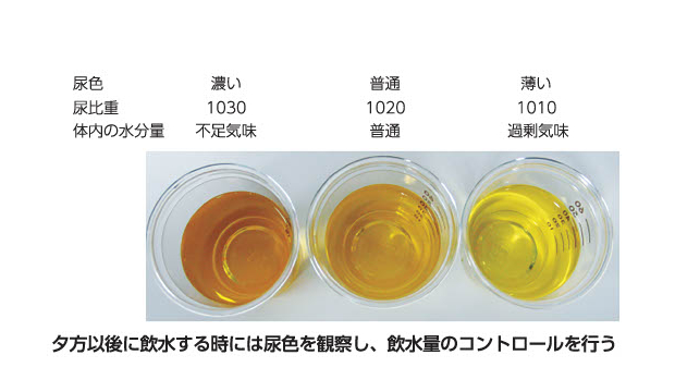 真夏など暑い季節あるいは運動後の水分制限は難しいですが、夕方以後、あるいは夕食時に水分を欲しがる時には尿色を観察する習慣が必要です