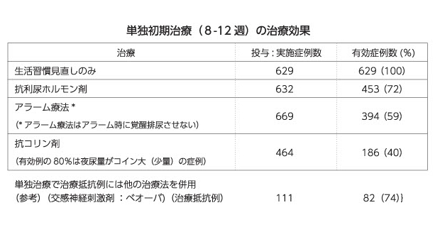 ●残りの症例には抗利尿ホルモン剤、アラーム療法、抗コリン剤の治療が行われました。各単独治療の効果をみますと、抗利尿ホルモン剤の投与の効果が最も優れており、次いでアラーム療法、抗コリン剤の順番でした。