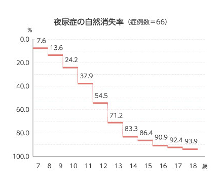 小学校1年生で夜尿外来を受診し、初診時夜尿頻度が4日/30日以上(尿失禁なし)みられ、その後外来受診せず、10年以上自宅で経過観察していた66例